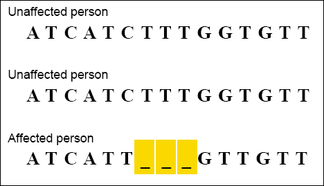 CLUSTAL alignments are sometimes used by scientists examining genetic variation within a population. For example, once a gene has been associated with a disease, scientists can use CLUSTAL to examine how the gene sequence varies among people with and without the disease. The example below shows a CLUSTAL alignment of DNA sequences from a portion of the gene associated with cystic fibrosis. The person affected by the disease is seen to be missing a three-base DNA sequence.
